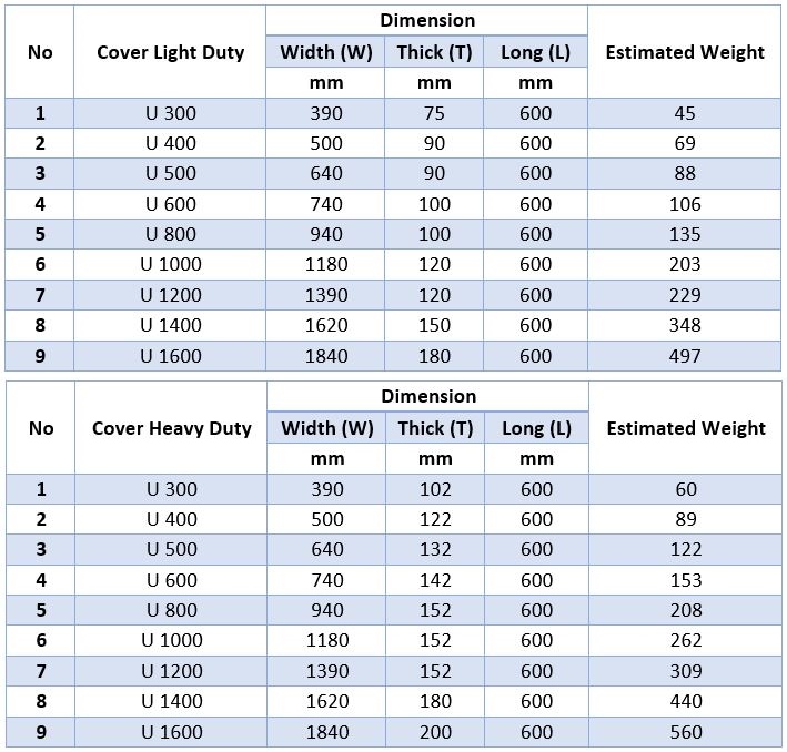 | No | Cover Light Duty | Dimension | Estimated Weight | Harga | ||